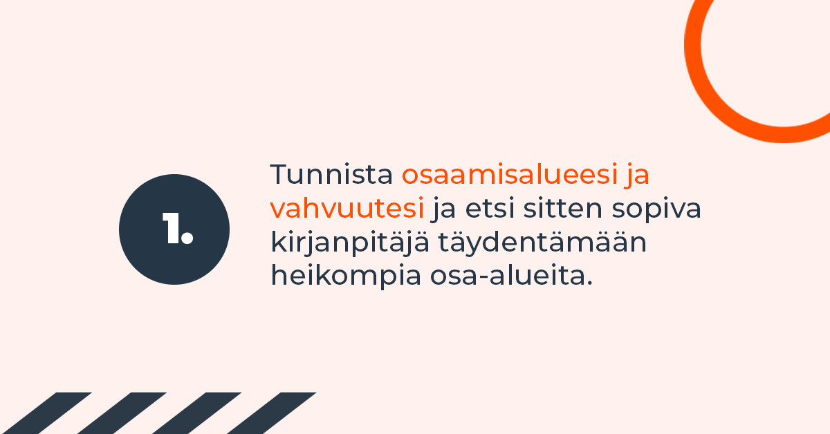 Vinkki 1. Tunnista osaamisalueesi ja vahvuutesi ja etsi sitten sopiva kirjanpitäjä täydentämään heikompia osa-alueita.