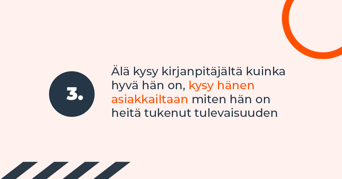 Vinkki 3. Älä kysy kirjanpitäjältä kuinka hyvä hän on, kysy hänen asiakkailtaan miten hän on heitä tukenut tulevaisuuden menestyksen rakentamisessa.